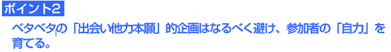 その方が参加者の自立心も育ちます。定番告白システムを導入しないことでなかには「全然出会えません」とクレイムを言う人がいます。100人に1人ほどです。しかしもともと「出会いは与えられるもの」ではなく「自分で楽しみながら広げるもの」ですから、それをを知って貰う良い機会です。本人のためにも「自力トレーニング」をしてもらう必要があります。異性から受け入れられる自分になるための努力なしには、未来はありません。「他力本願ではいつまでも恋愛関係は築けない」それを参加者にわかってもらう必要があります。オクテな人が自然に社交的になるゲームや仕掛け、さらには講座、ワークショップを設けながら、婚活イベントということを忘れさせる空気の中で進行することが望まれます。 |