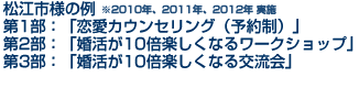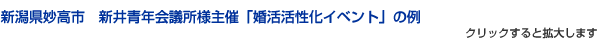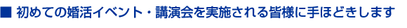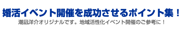 さて、今回はそんな私の経験から「行政・団体様のための「はじめて婚活イベント開催講座」 地域活性化、少子化ストップのために」をテーマにお送りしたいと思います。「行政・団体がはじめての婚活イベントを成功させるポイント」と称して以下に要点をまとめてみました!ぜひ参考にして頂けたら幸いです。 |